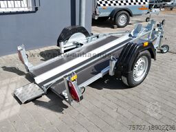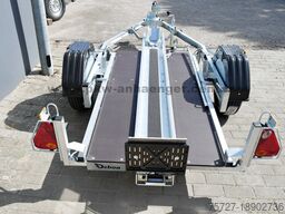 Motorfietstrailer van de fabrikant Cheval Liberté, ook bekend als Debon. De Roadster-Moto1 met kantelbaar platform is zeer eenvoudig te laden en te lossen. Via een voetsteun kan de laadvloer worden neergelaten. Aan de achterzijde bevindt zich een kleine oprijklep. U rijdt via de geleiderail tot in de motorsteun, waarna het mechanisme het platform weer omhoog brengt. Vervolgens kunt u de motorfiets eenvoudig vastzetten met sjorbanden aan de standaard, zeer robuuste bindogen.