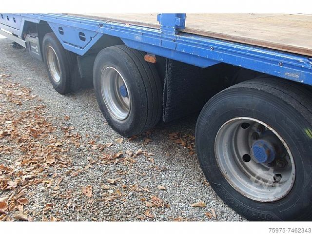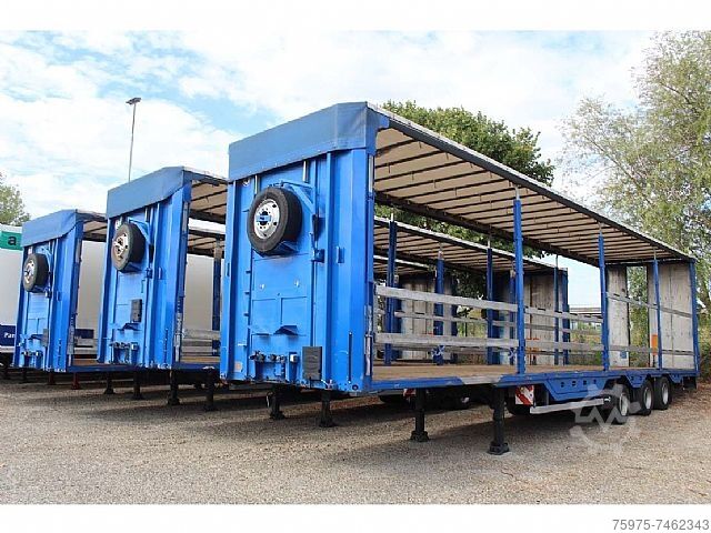 3 stuks Meusburger verlaagde vlakke opleggers met rechte achterzijde en achterramps, koppelschotel op 1 meter, 3 assen waarvan de 3e meesturend, uitsparingen in het laadplatform, verstelbaar huif (hefbaar/neerlaatbaar), schuifzeil, achterdeuren, binnenhoogte 3,10 m, gekeurd tot 31-10-2022. Aangeboden door dealer Interdrive Srl - Parma.